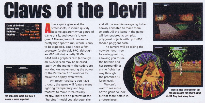 Claws of the Devil is a late Amiga title that was in development back in 1998, and was a first person action game for platforms with expanded memory, additional graphics cards and PPC turbo cards according to Amiga Computer Studio.