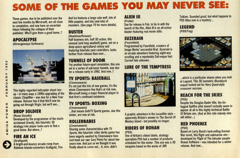Originally the title was set to see release for Christmas 1991, but unfortunately Image Works would go under after the disappearance of Robert Maxwell. There was talk of trying to find a new home for the game shortly afterwards, but sadly it was never picked up.