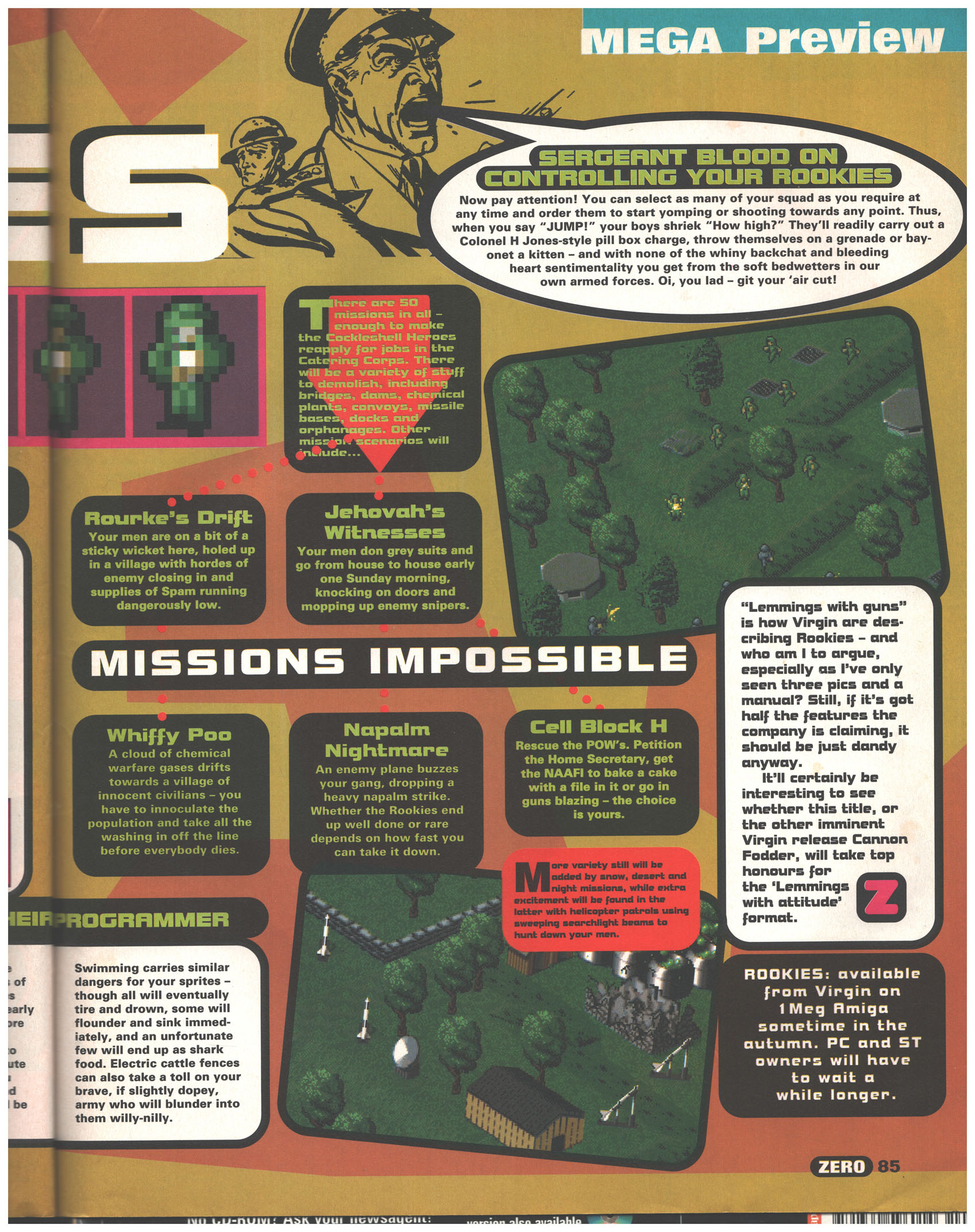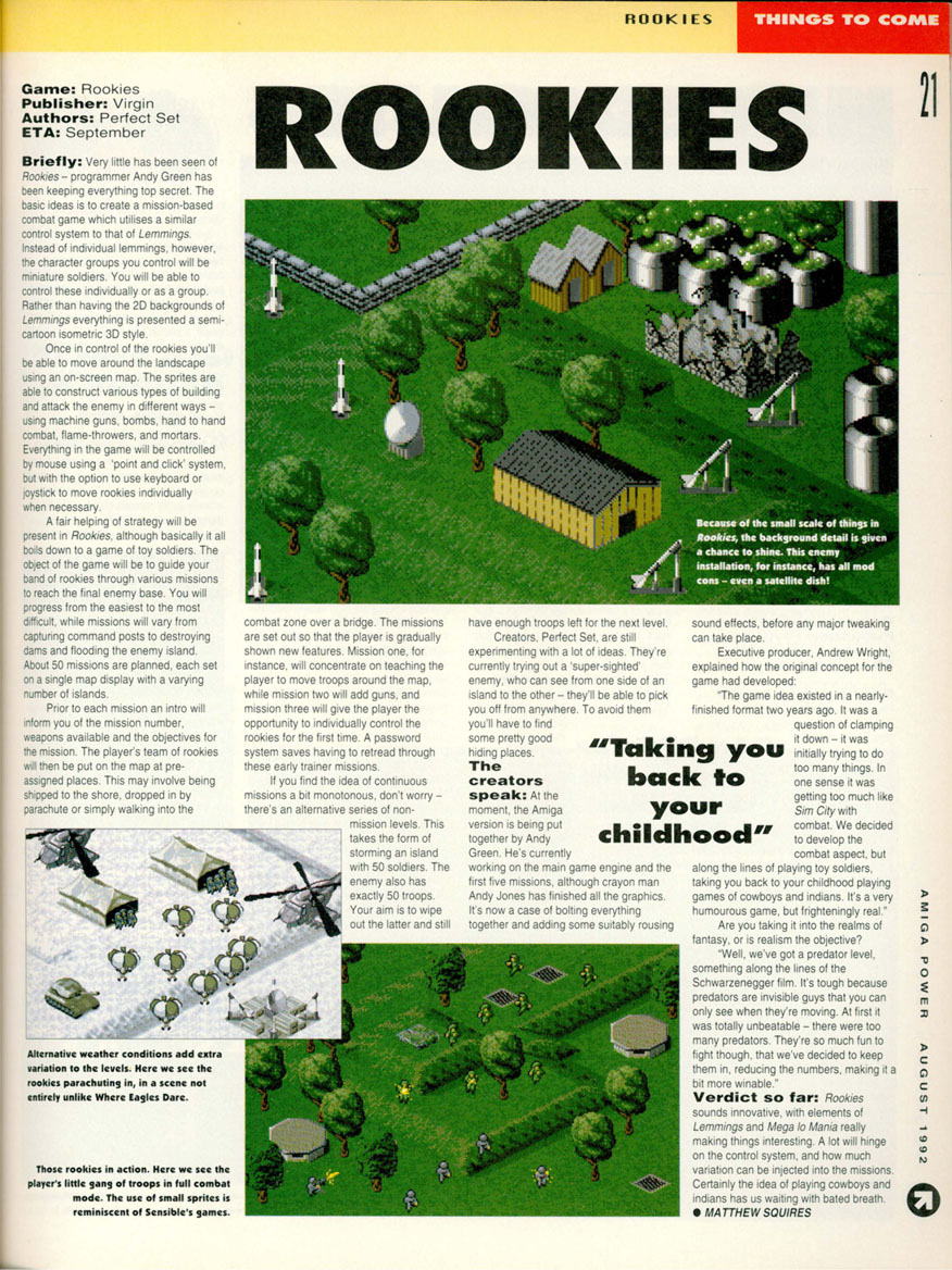 You would control a group of soldiers, where you could upgrade their firearms from pistols to flame throwers and go against heavily armoured vehicles and other soldiers. Amiga Power described the game as being a “Paintball simulation”, which doesn’t seem to add up compared to the other previews of the game, who called it “Lemmings with missions”