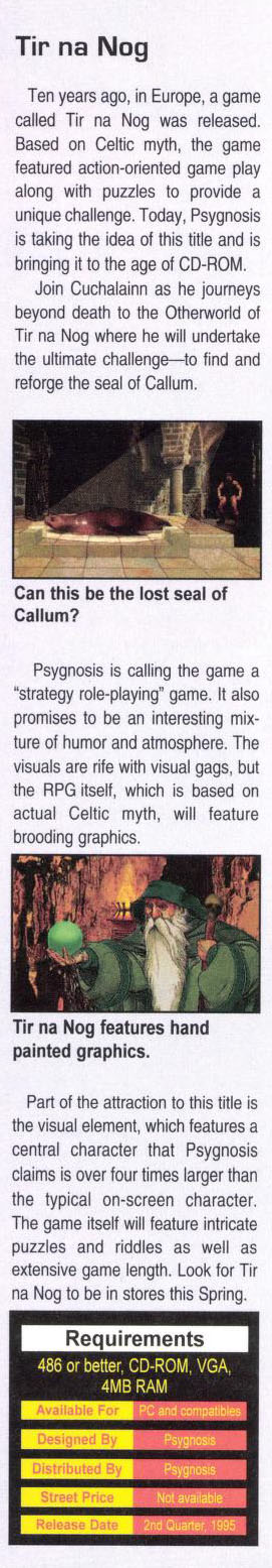 The gameplay would consist of hand-to-hand combat, puzzle solving and exploration, where the main protagonist, Cuchulainn, will encounter many strange beasts on their travels. Psygnosis described the game as a strategy role-playing title with a mixture of humour and atmosphere.