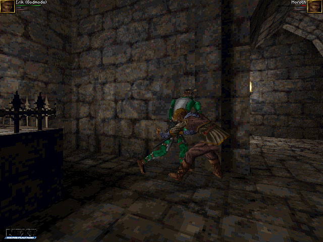 Too bad it never got released. Back then we thought that its graphics were better than Quake’s, especially since it ran much better on our 486 machines than Quake’s demo did – especially on non-Intel CPUs (Quake was heavily optimized towards Intels floating point pipeline, which no other processor manufacturer at the time had, I believe). But keep in mind that this demo didn’t include any actual logic, had a very limited amount of characters, and small rooms – little of that did we realize back then.