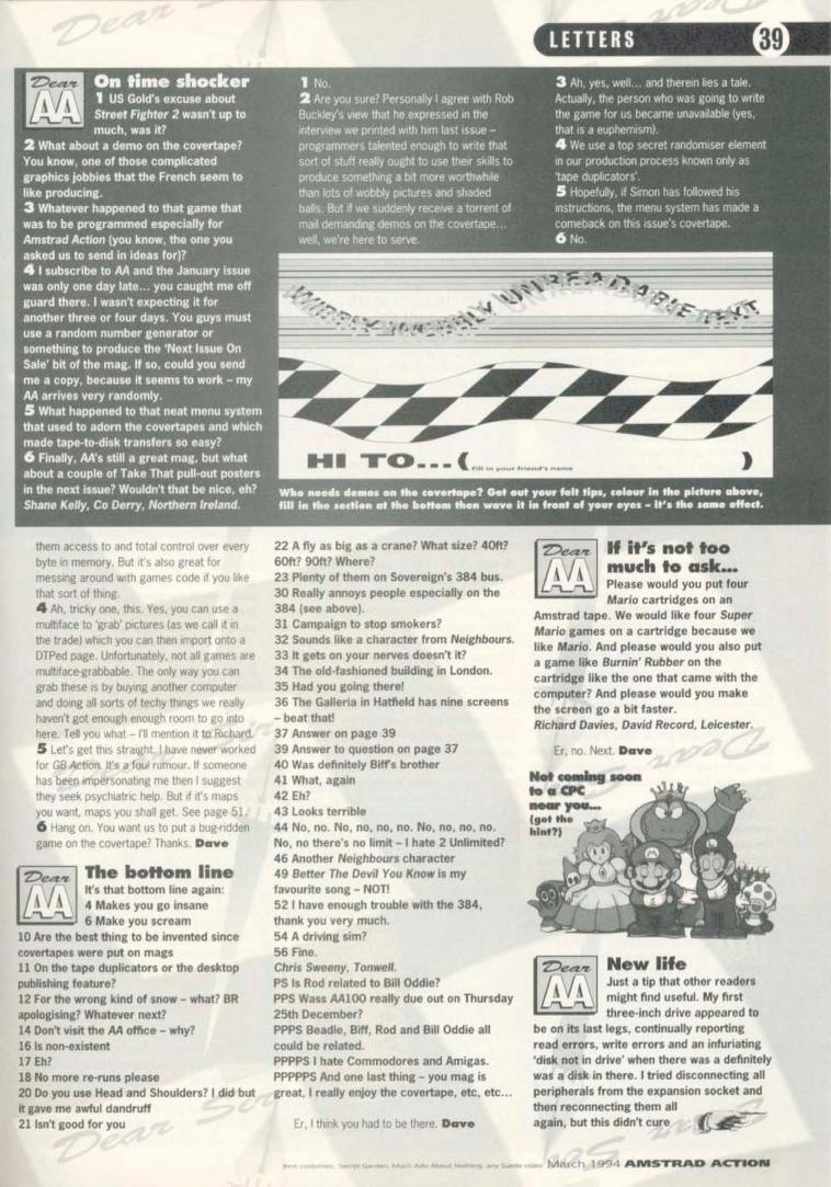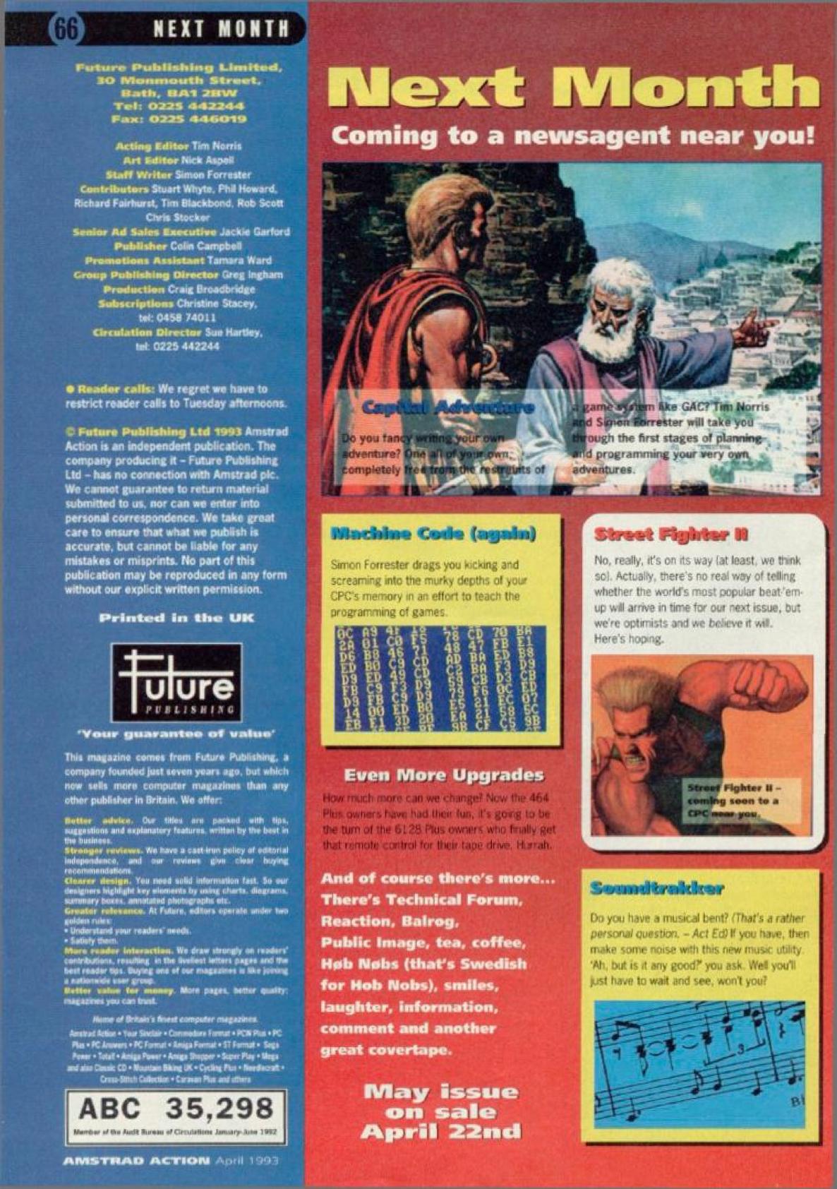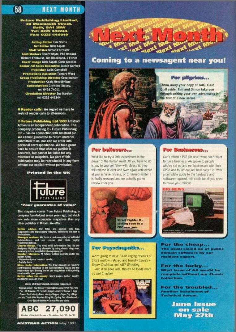 The new editor of Amstrad Action, Tim Norris, then reported that the game was coming soon in issue 91, and each issue would go on to include a next month segment promising a review of the game. From this point, it started to become a bit of a running joke at the magazine where U.S. Gold kept fobbing the magazine off with constant delays.
