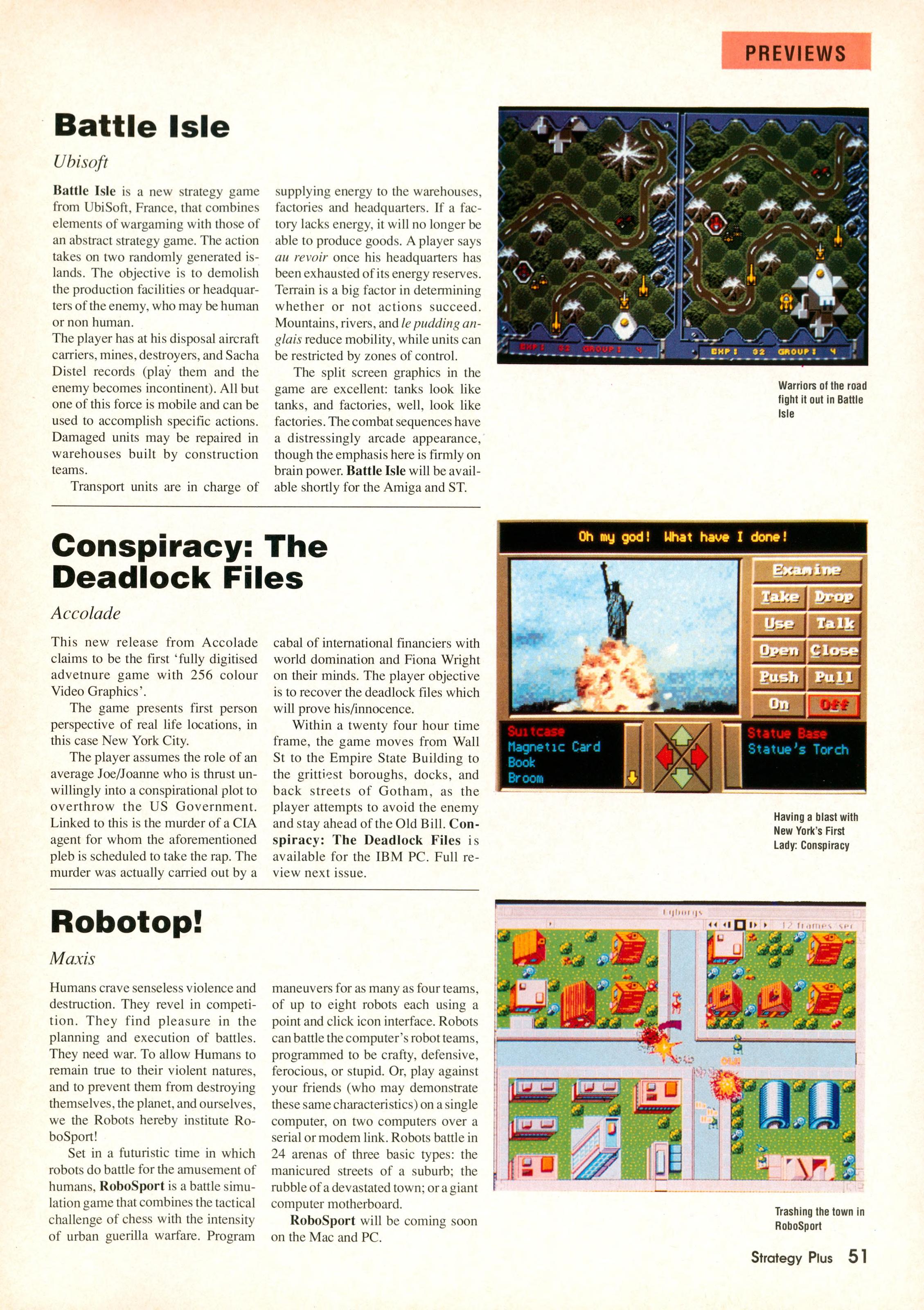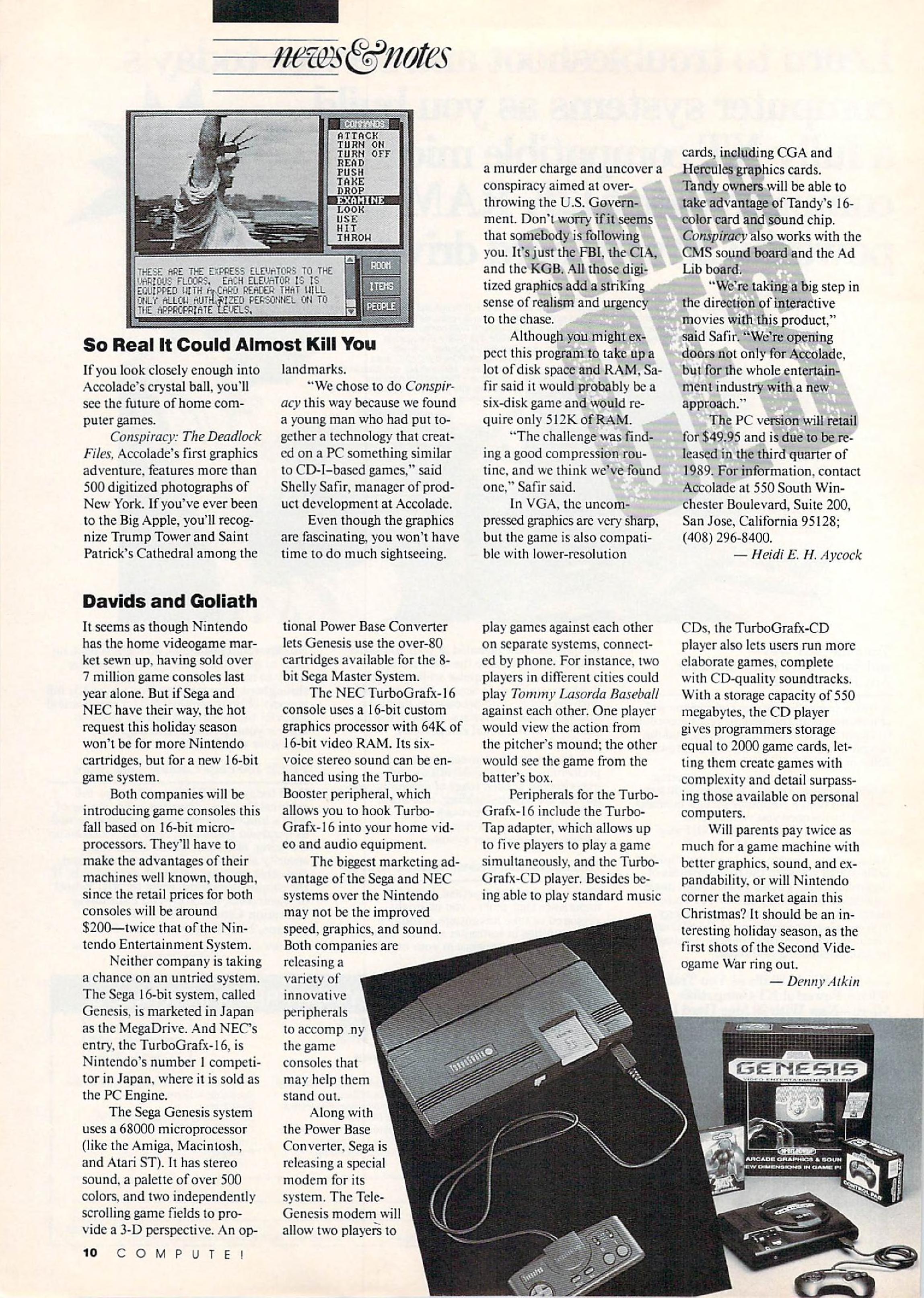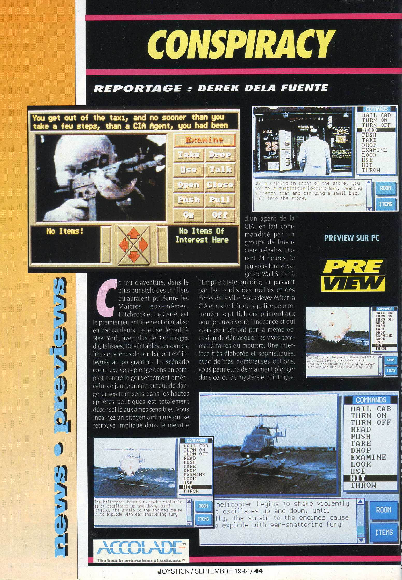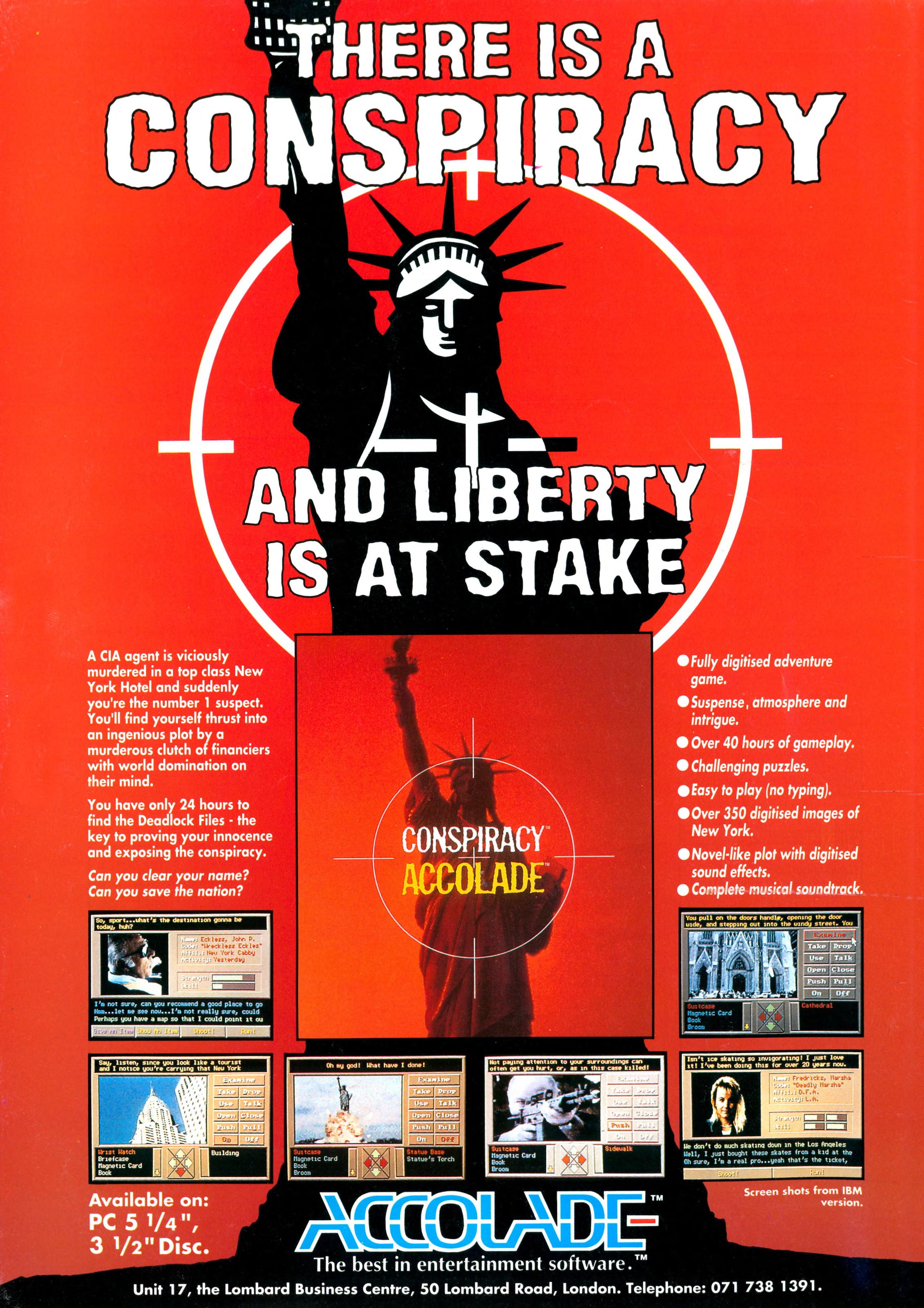 It was expected to be a “six disk” game and would support Tandy, CMS and AdLib sound. Conspiracy would also support CGA and Hercules, and would require 512KB RAM. It was expected to retail for $49.95 and was due to be released in the third quarter of 1989.