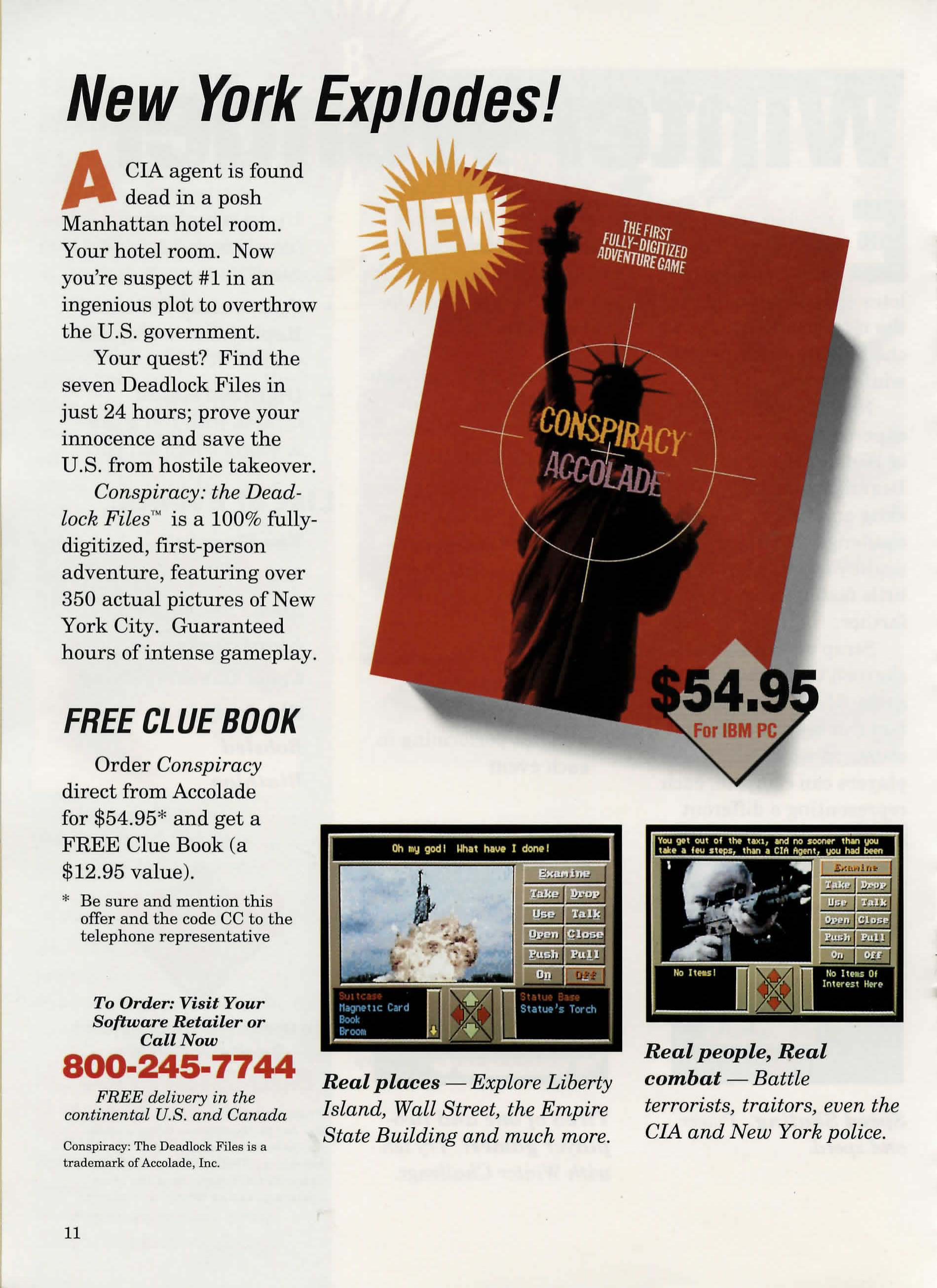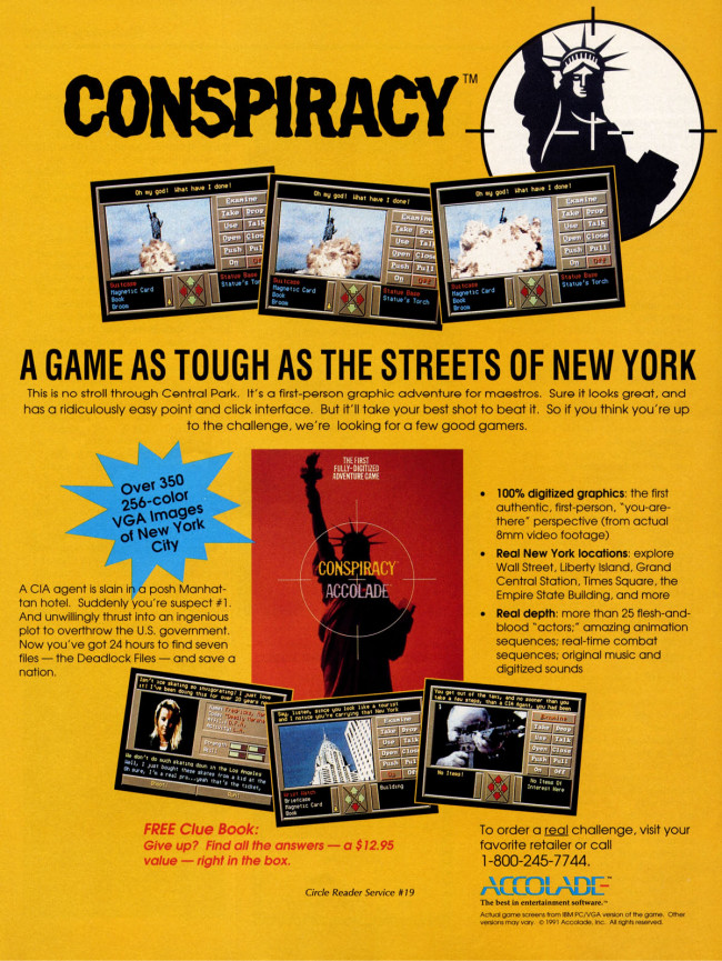 The retail price was set at $49.95, though Accolade also ran a direct-order promotion for $54.95 bundled with a free clue book (valued at $12.95). Safir described Conspiracy as “a big step in the direction of interactive movies,” positioning it as not just a game but a glimpse into the future of computer entertainment.