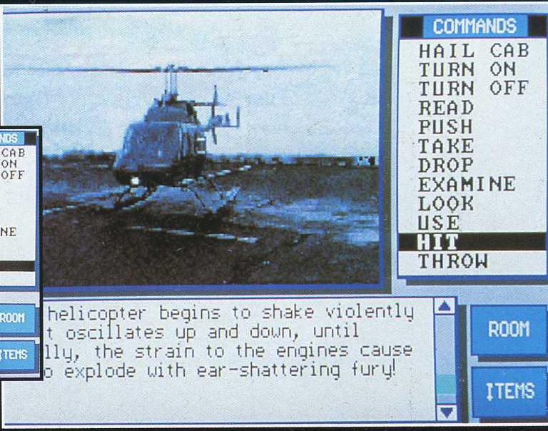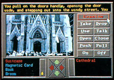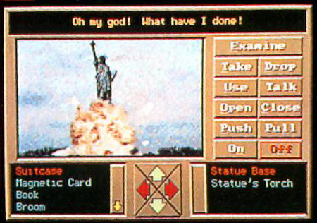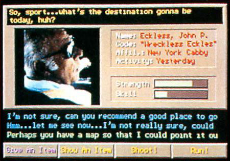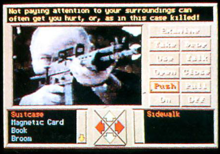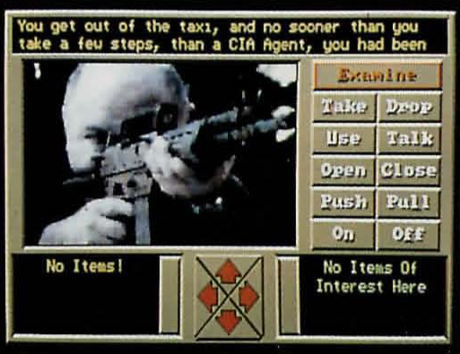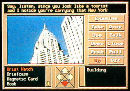 Gameplay also included a typical parser-style interface with commands like Examine, Take, Drop, Use, Talk, Open, Close, Push, Pull. The story revolved around tracking down seven Deadlock Files within 24 hours to clear your name and stop a plot to overthrow the U.S. government.