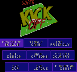 Upon loading up, you’re greeted with a familiar intro screen, but with an updated “Super Kick Off” logo and different company graphics, which are also put at the top of the page, and with different credits. There is then a completely new intro screen with the crowd sample, and the well-known Super Kick Off cover artwork. Interestingly, the “Off” text is missing – which could be a glitch with the ROM or something that hadn’t yet been implemented.