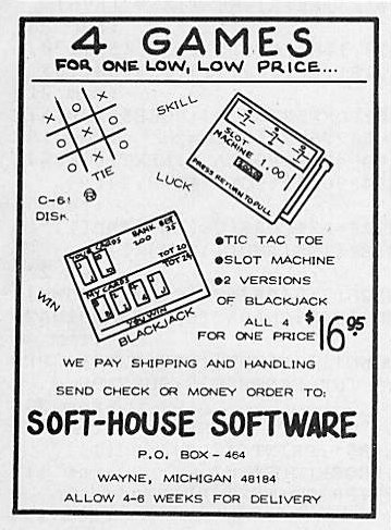 A small compilation of games including Tic Tac Toe, Slot Machine and 2 versions of Blackjack”‹. It is likely to be a compilation that was written in BASIC and sold only via mail order.