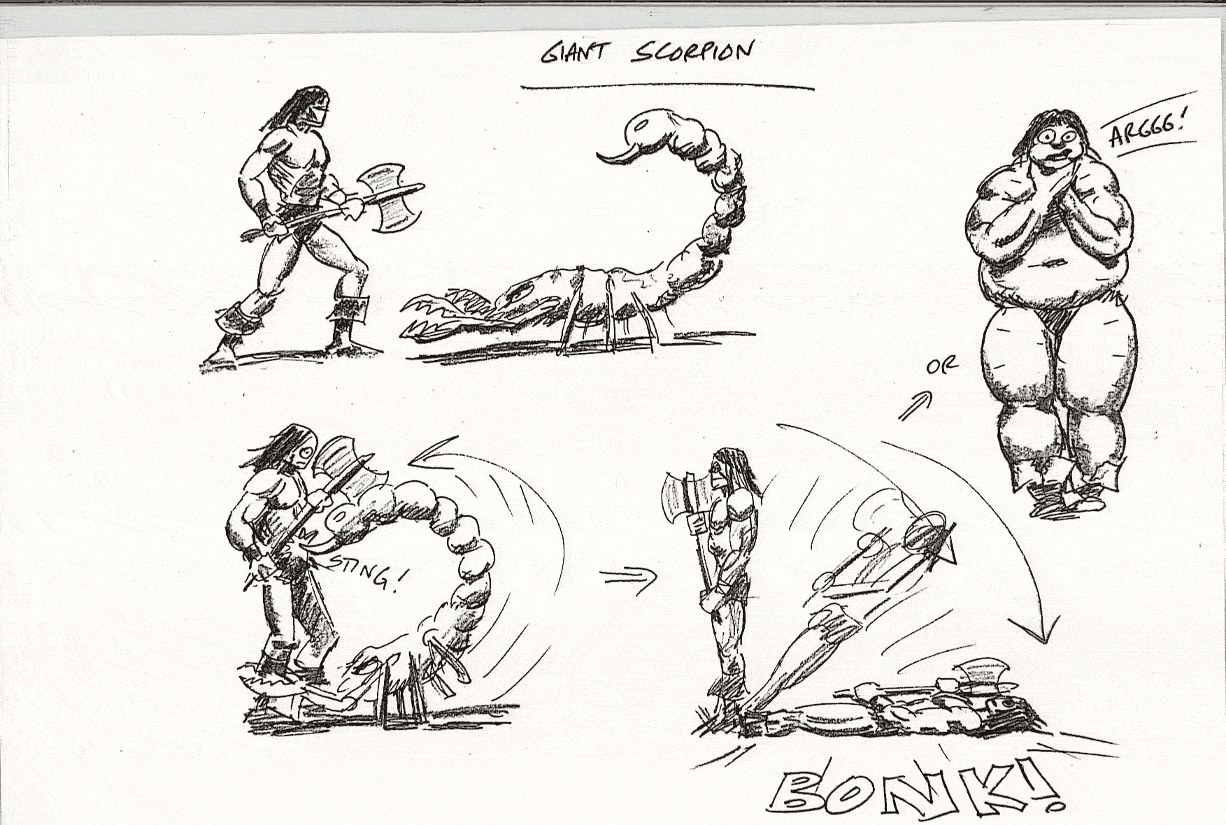 The arcade adventure sections would be similar to Barb II but with scrolling backgrounds (much nicer) and loads of cool new gags/monsters/deaths.