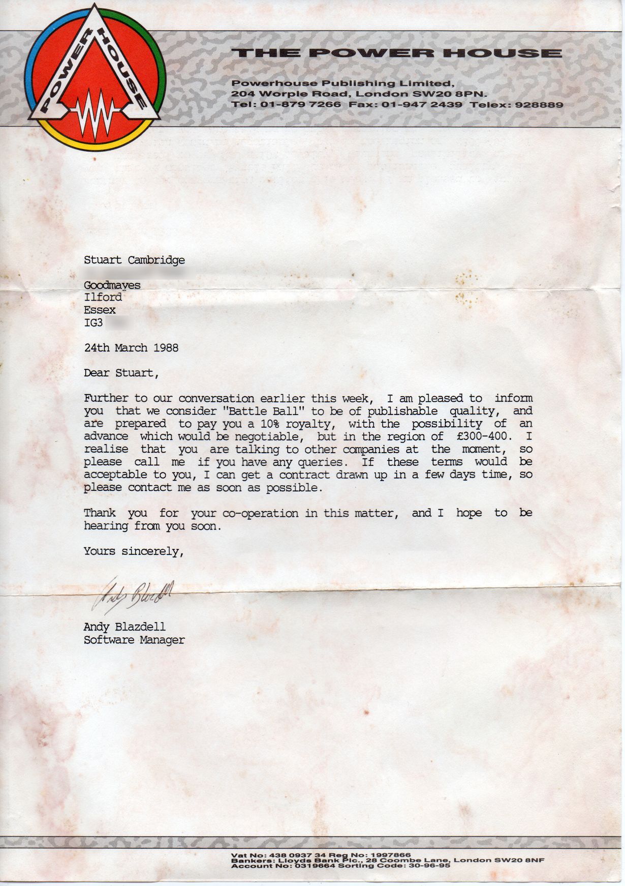 In 2020, Stoo dug out some development notes and a print out of a loading screen which seems to be lost. Also, a letter from The Power House with a first offer for the game.