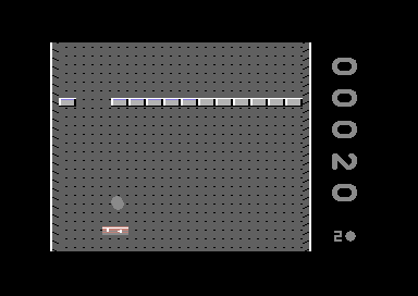 Mirror Image is my attempt at a ‘split concentration’ space shooter, where you control two ships and get attacked from the top & bottom of the screen. There are three designs of enemy ship that change every 100 points, you get a spare life at 300 points, and you have to score 99,999 points to win. It was my first-ever machine code game. Someone at Alphavite kindly patched it with a freezer cartridge to fix a bug, but this meant the ending no longer works – argh!