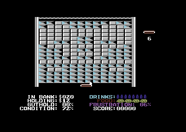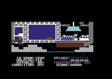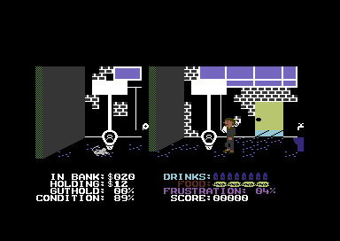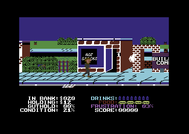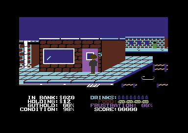 “I programmed this game in assembler around 1988-89. Took me a year of my spare time I still got the handwritten designs of the graphics, memory addresses etc. Once finished the playability and graphics was too outdated to have it commercially set out. The idea was to have the character survive by working at the build site, eating, drinking, getting money out of the bank, empty the guts in the toilet, distraction at the playroom, brothel and fitness room.