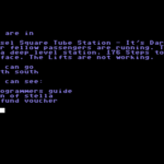 “The game is a text adventure. Primary location is London and the underground. Map is based around underground levels and areas above each station. Main character is stranded at Russell square station (deep line) and after a few hours the group move on and the adventure.