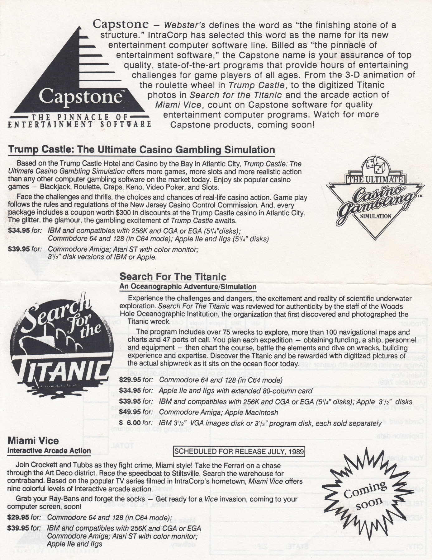 A Capstone advertisement was found in a US sales catalogue from 1989, so it does seem that a game was on the cards. It is currently listed as abandonware on the PC Dos platform.