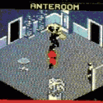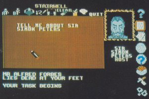 The maid tells you she saw Lord Demetrius near the scene of the crime just before it happened and also that he stood to inherit the leadership of a popular 8-bit computer project from Sir Plate. You decide to explore the Manor’s four floors in search of more clues. Movement is achieved by clicking the cursor over an exit. A map screen comes in useful for navigation — and knowledge of the house layout is also essential for working out if a suspect could have reached the scene of crime in time.