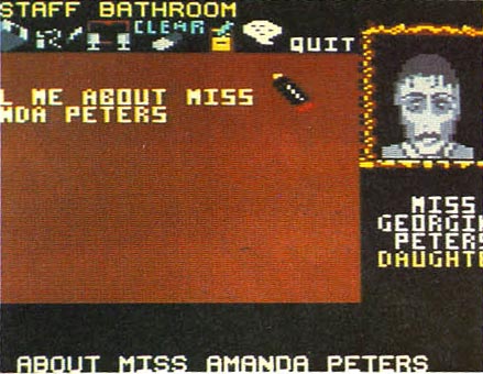 First thing to do is question a few of the many people staying at the mansion. You can ask about any of the other occupants, the many rooms and various household objects (including five types of pistol and four knives!). In addition you can ask more specific questions about the relationship between two people (murder motives include inheritance, blackmail and lust) or about a particular person in a particular place with a particular object etc. Of course the person may not know anything, or even lie. Any useful answers can be entered in your notebook by clicking on an icon. The notebook is divided into four sections: people, places, clues and motives.