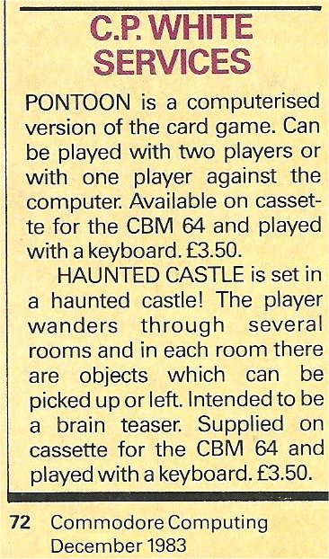 C.P.White did release their other game called Haunted Castle, which can be found in Gamebase already. So hopefully there is a chance that Pontoon could be preserved soon.