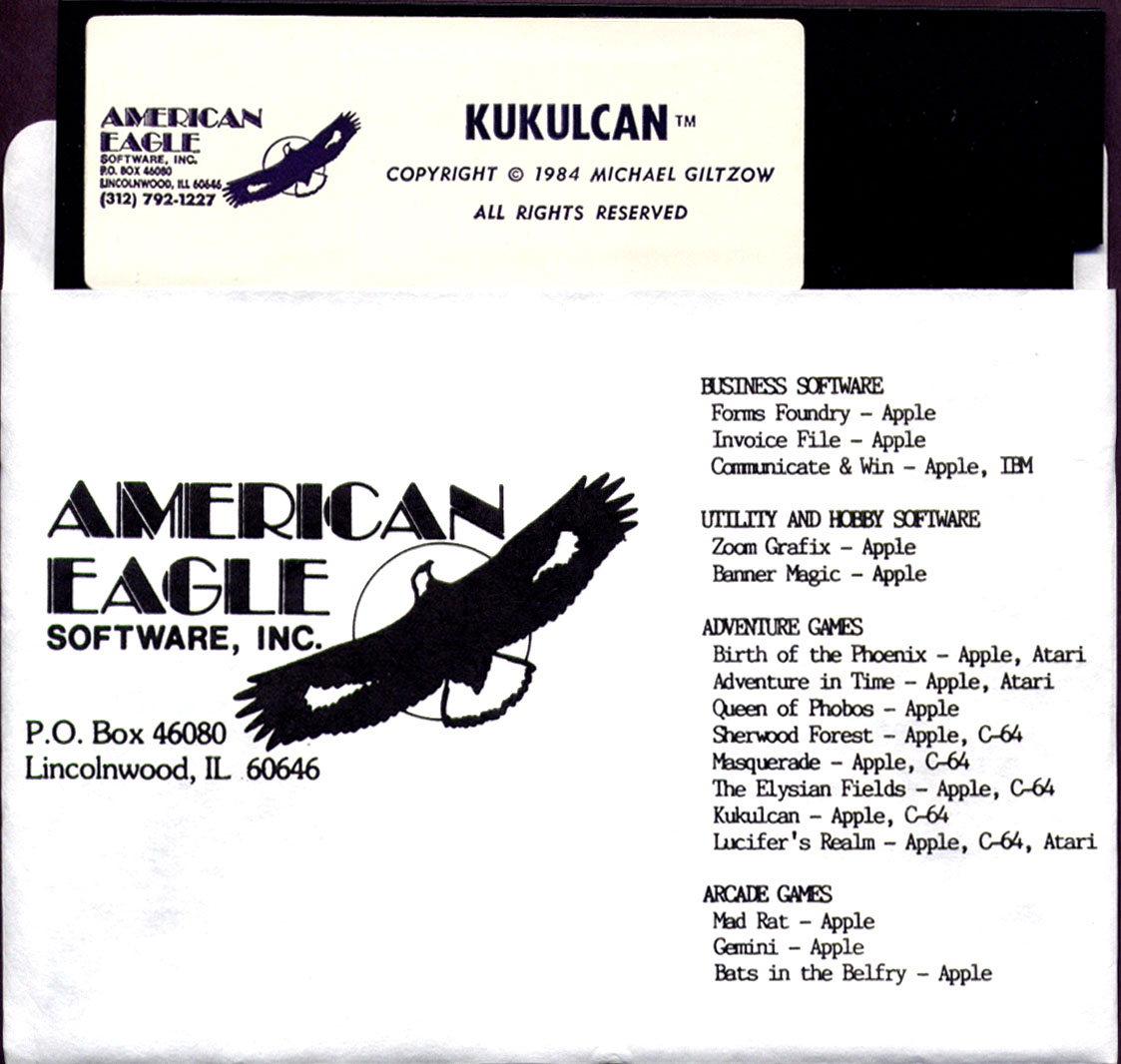 A very quick entry thanks to Peter Weighill for a game that was advertised by American Eagle in 1984 on the disk cover for Kukulcan on the Apple. Sherwood Forest was released on the Apple 2, but the Commodore 64 edition of the game seems to be completely at large.