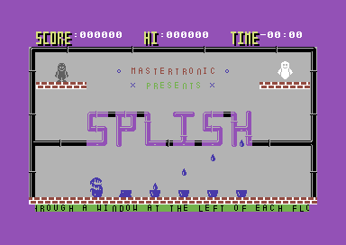 Splish Splash is a previously unknown game that was intended for release on the Mastertronic budget label back in 1985. The game itself was written by Adrian Sheppard, who around the same time had/was converting One Man and His Droid to the C64. Adrian would later go on to develop Vampire and Grand Prix Simulator for Codemasters, as well as Pipe Mania for Empire.