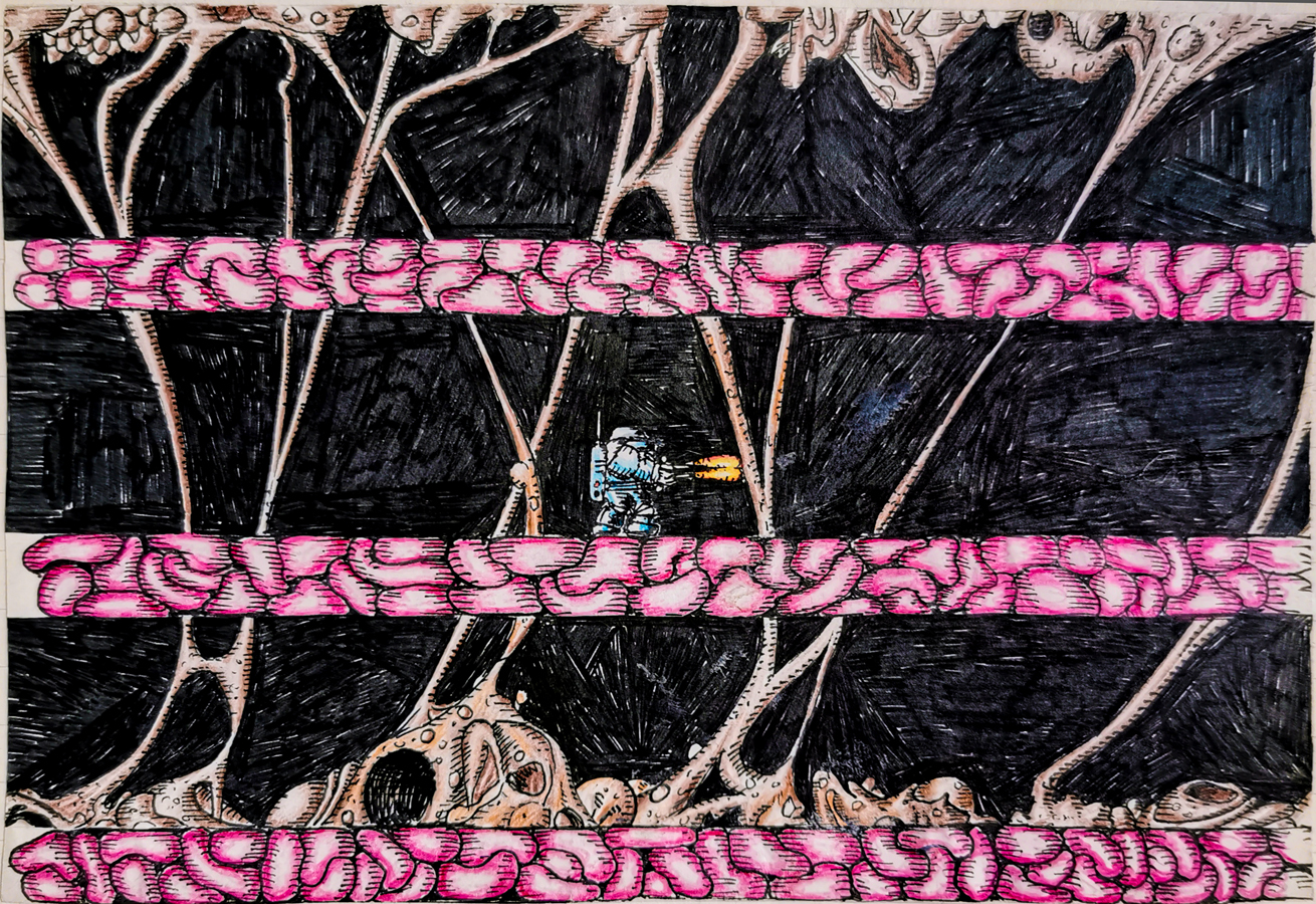 Then in 2020, Ned Langman pulled out a concept drawing for a platform level that was to be in the Hades Nebula sequel, possibly as a sub level of some kind. According to Ned, there was to be a twist in the game where you played the bad guy. A fallen Emperor Hades.