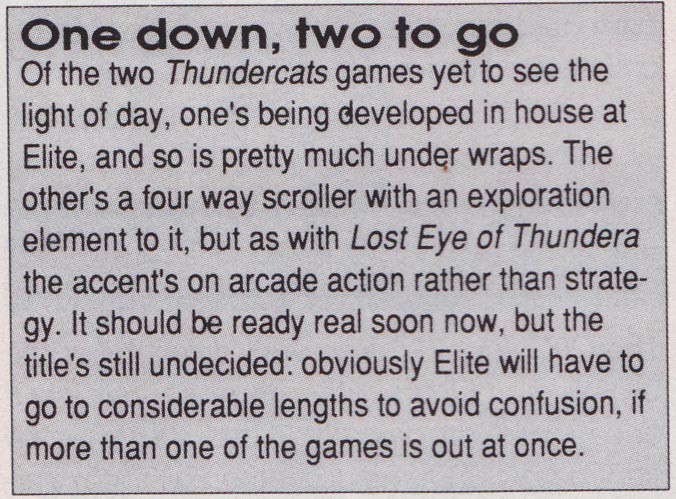 Thanks to Patrick Furlong for originally suggesting, but it seems that according to one of the Amstrad magazines of the time (Amstrad Computer User), the game Beyond the Ice Palace was actually intended to be a Thundercats game for Elite. Nick Jones confirmed to GTW64 that this was the case, and it was to be the second game in a series of three.