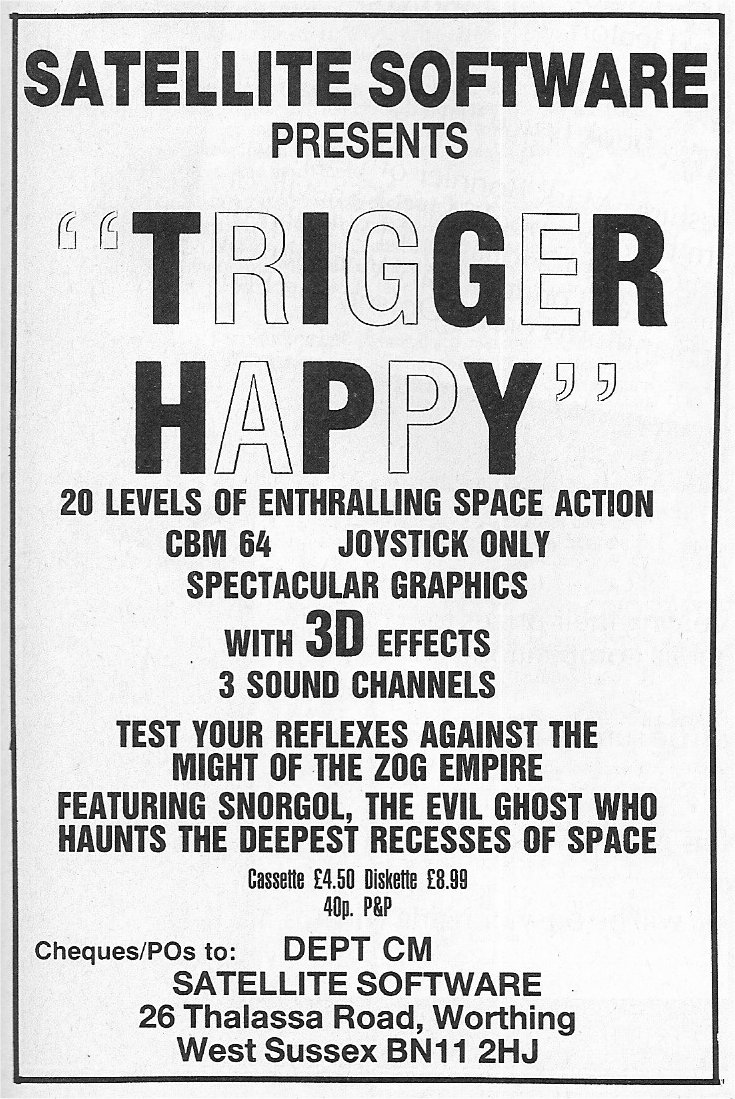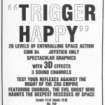 Advertised in the December 1985 issue of Commodore Computing International, Trigger Happy was a game to be released by Atlantis Software. Not the same Atlantis Software we all know, as they changed company name the next month to Satellite Software – probably as they realized there was a company already with the same name!